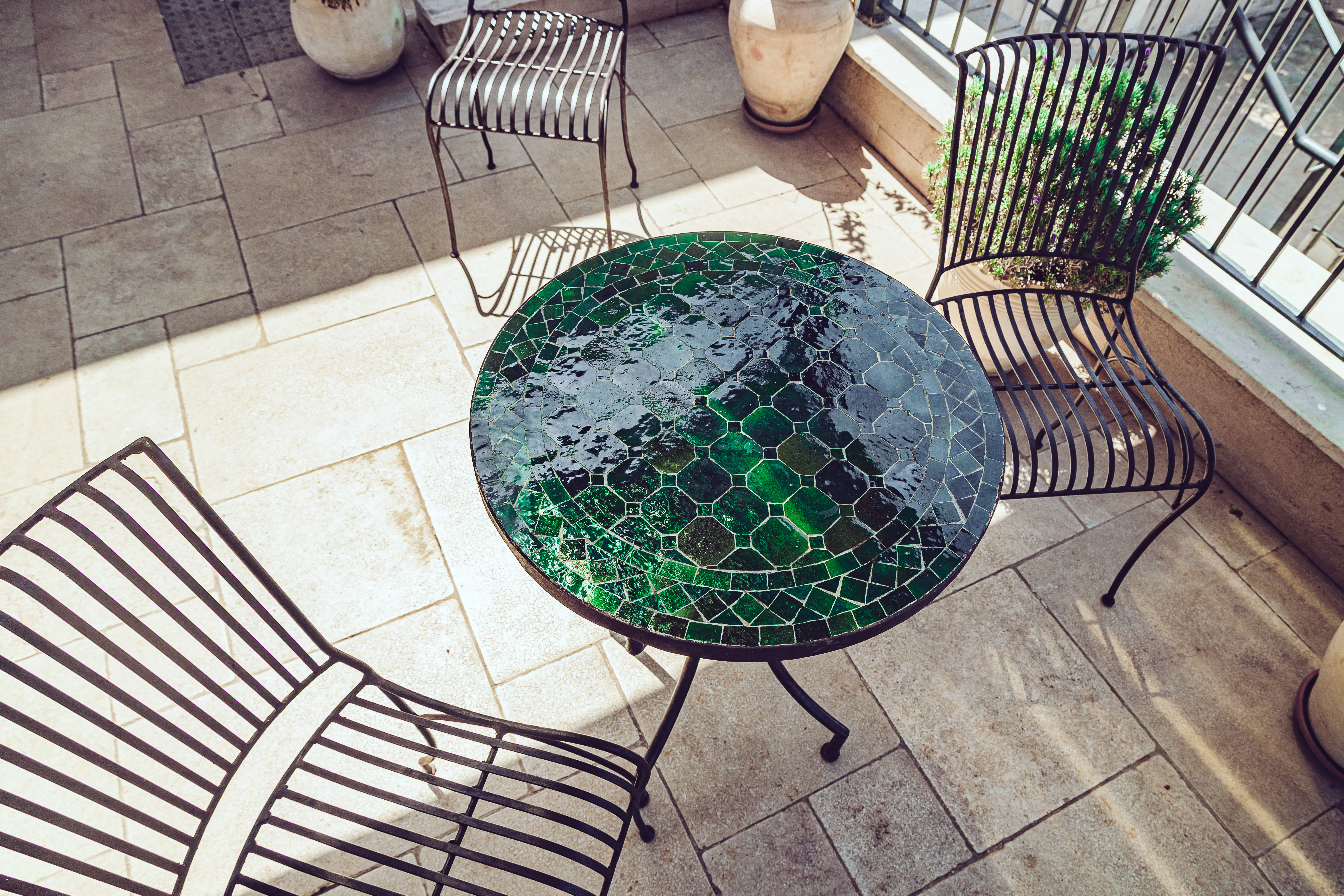 Compact and stylish black wrought iron set with cushioned chairs and a small round table