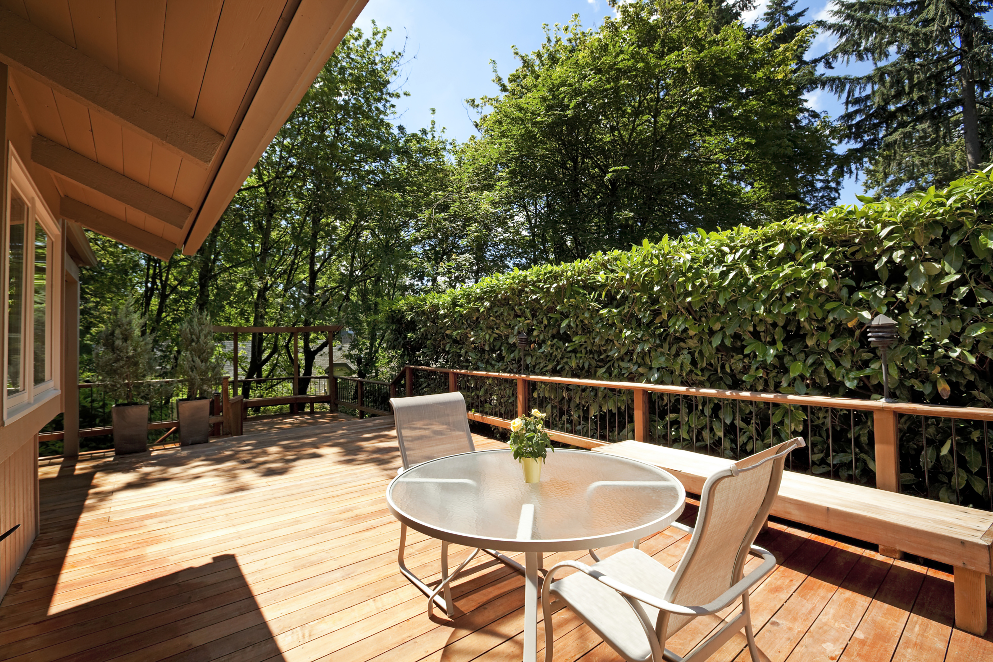 Natural wood finish with cushioned bench and two chairs, perfect for outdoor dining